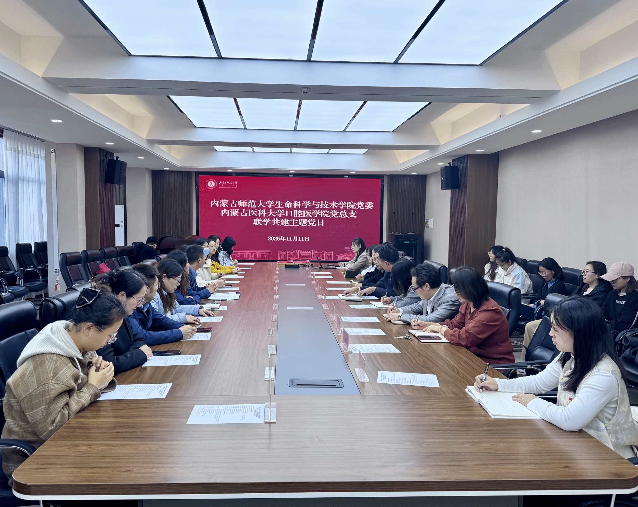为深入学习贯彻党的二十届四中全会精神,强化基层党组织政治功能与组织功能,探索校际党建共建与学科融合新模式,11月11日下午,yl6809永利官网集团与内蒙古医科大学口腔医学院开展联学共建主题党日活动。两院领导班子、党支部书记、科室负责人和部分党员师生代表参加活动。主题党日活动由苏小波主持。