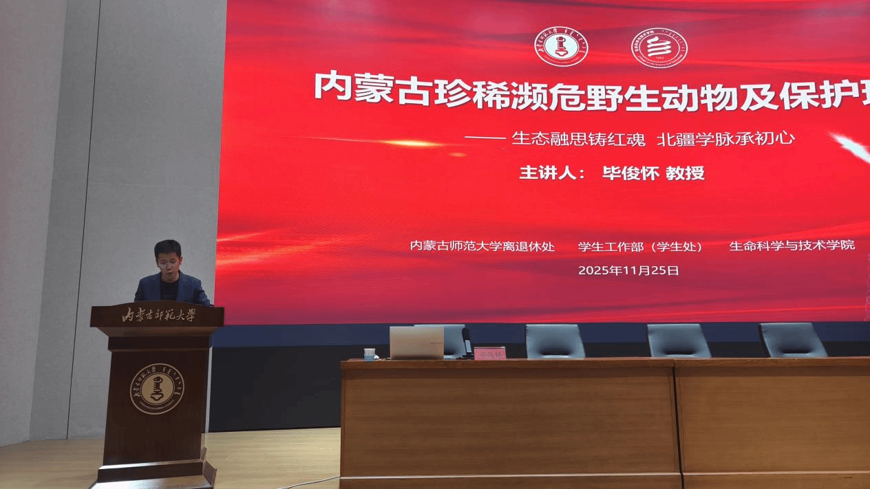 为扎实推进党建与育人工作深度融合,营造良好的学风氛围,2025年11月25日,yl6809永利集团学生工作部(学生工作处)、离退休教职工工作处联合主办,yl6809永利官网集团承办的离退休教授宣讲活动在赛罕校区信息楼学术报告厅举行。本次活动以"生态融思铸红魂,北疆学脉承初心"为主题,邀请毕俊怀教授做了题为《内蒙古珍稀濒危有蹄类动物资源现状与保护》的专题讲座。