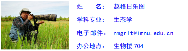 赵格日乐图,男,蒙古族,中共党员,博士,教授,生态学(动物生态学)学术研究生导师,学科教学(生物学)专业硕士导师,蒙古国教育大学外聘博士生导师。中国动物学会鸟类学分会会员,内蒙古动物学会理事会常务理事,内蒙古自然资源学会理事会理事。2015年入选内蒙古自治区新世纪“321”人才工程第二层次。主要研究方向为鸟类生态学及野生动物保护管理。主持完成国家级科研项目1项、省部级科研项目3项、地厅级科研项目2项,科技合作横向项目4项;参与完成国家级科研项目4项,省部级科研项目1项、国际合作项目1项;现主持科技合作横向项目3项。国内外学术期刊上已发表学术论文40余篇。出版学术著作有《内蒙古达赉湖自然保护区鸟类区系及群落生态学研究》(主编,2012)、《宁夏灵武白芨滩国家级自然保护区综合科学考察报告》(副主编,2018)、《乌海百鸟》(副主编,2018)、《内蒙古两栖爬行动物》(主编,2021)和《内蒙古保护动物》(主编,2021)。主编蒙文教材有《脊椎动物学实验指导》(2012)和《脊椎动物学》(2015),参编教学参考书2部,科普译著1部。学校第五届和第六届“中青年教师教学技能大赛”中分别获一等和二等奖,内蒙古自治区第六届“青年教师课堂教学技能竞赛”中获三等奖。“脊椎动物学”教学课件2010年和2011年分别获自治区第五届民族教育永利集团成果二等奖和学校第十届教学成果一等奖(集体成果)。编写的教材《脊椎动物学实验指导》2014年获学校优秀蒙古文教材一等奖。2015年获学校科研成果三等奖。2016年被评为学校蒙古语教育教学先进个人,课程讲授被学校评为“精彩一课”。2018年荣获学校“五四共青团最佳支持者奖章”。编写的教材《脊椎动物学》2019年获学校优秀蒙文教材二等奖。指导的研究生毕业论文曾荣获学校优秀学位论文,被评为学校优秀研究生指导教师。曾荣获学校优秀共产党员和优秀班主任等。承担本科生“动物学”、“动物学实验”、“动物学实习”等课程,承担研究生的“动物生态学研究进展”、“动物生态学研究方法”、“生物地理学”、“鸟类学”等课程。