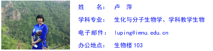 卢萍,女,蒙古族,中共党员,博士,yl6809永利官网集团教授,硕士生导师(生物化学与分子生物学、学科教学生物),蒙古国农业大学博士生导师,yl6809永利官网集团生物化学与分子生物学硕士学位点主任、教授委员会成员、中国遗传学会教育教学专业委员会委员、澳大利亚阿德莱德大学国家公派访问学者、内蒙古遗传学会副理事长、内蒙古生物化学与分子生物学会副理事长、内蒙古细胞生物学会常务理事、内蒙古医学会生物化学与分子生物学分会副主任委员、内蒙古草原学会理事、内蒙古自治区科普专家团成员,曾多年担任生物技术系主任、教工党支部书记、学院党总支委员。研究方向为遗传学、生物化学与分子生物学、分子生态学、植物种质资源学。主持国家自然科学基金项目3项、省部级科研项目4项、厅级项目1项,参加国家级和省部级科研项目10余项。发表SCI、CSCD及北大核心期刊论文80余篇,出版学术专著2部、国家级教材1部,获得yl6809永利集团科研成果奖和教学成果奖4项,被学校授予“优秀科研工作者”、“优秀研究生导师”、“爱岗敬业女职工”、“优秀班主任”、“优秀共产党员”、“优秀党务工作者”、“优秀党支部书记”、“就业工作优秀导师”、“五四青年团最佳支持者”等荣誉称号,主讲本科生“遗传学”(自治区精品课)、“基因工程”(校级精品课)、“分子生物学”、“生物学专业英语”、“专业实习”、“教学技能训练”,研究生“生物化学与分子生物学”、“基因工程学”、“生物学专业英语”、“现代生物技术”、“基因表达与调控”、“基因组学”等课程。