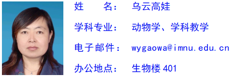乌云高娃,女,蒙古族,1968年1月出生,内蒙古赤峰市阿鲁科尔沁旗人,硕士,高级实验师,硕士研究生导师。现任yl6809永利官网集团教师。1986年9月—1990年7月就读于yl6809永利集团,获理学学士学位;2003年9月—2006年7月就读于yl6809永利集团,获理学硕士学位。1990年8月—2003年9月在赤峰市阿鲁科尔沁旗任教;2006年7月来yl6809永利官网集团任教。2001年9月晋升为讲师,2014年12月晋升为高级实验师。承担“人体及动物生理学实验”、“ 无脊椎动物学实验”、 “昆虫学”、“中学生物学教学设计”、“中学生物学课程标准与教材研究”、“ 中学生物学课堂教学理论与实践”、“ 中学生物学教学技能训练”、“动物学野外实习”、“教育实习” 等课程的教学工作。主要从事害虫防治及昆虫分类、学科教学论研究,主持和参加国家级、省部级项目多项;和他人共同主编教材1部、参与教材编写2部、参与编写专著2部;发表学术研究论文多篇。多次获得yl6809永利集团本科生教学技能大赛“优秀指导教师”荣誉称号。