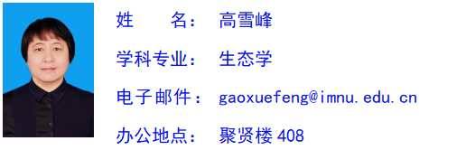 高雪峰,女,汉族,博士,副教授,学术研究生导师。研究方向微生物生态和土壤生态学。先后主持国家自然科学基金1项,内蒙古自然科学基金2项以及地厅级项目3项。出版研究专著1部,发表科研论文20余篇,教学研究论文2篇。2005年(第五届)和2015年(第九届)获yl6809永利集团中青年教师教学技能大赛三等奖。2012年和2021年获yl6809永利集团教学成果二等奖。先后承担本科生的土壤学、土壤学实验、恢复生态学、城市生态学、保护生物学、植物形态解解剖学、普通生态学实验、无机化学实验等课程的教学工作。并承担本科生的社会调查和应用生态学实习指导工作。承担研究生的土壤生态学、恢复生态学研究进展、可持续生态学(城市与可持续发展部分)和高级生态学(微生物生态学部分)课程的教学工作。