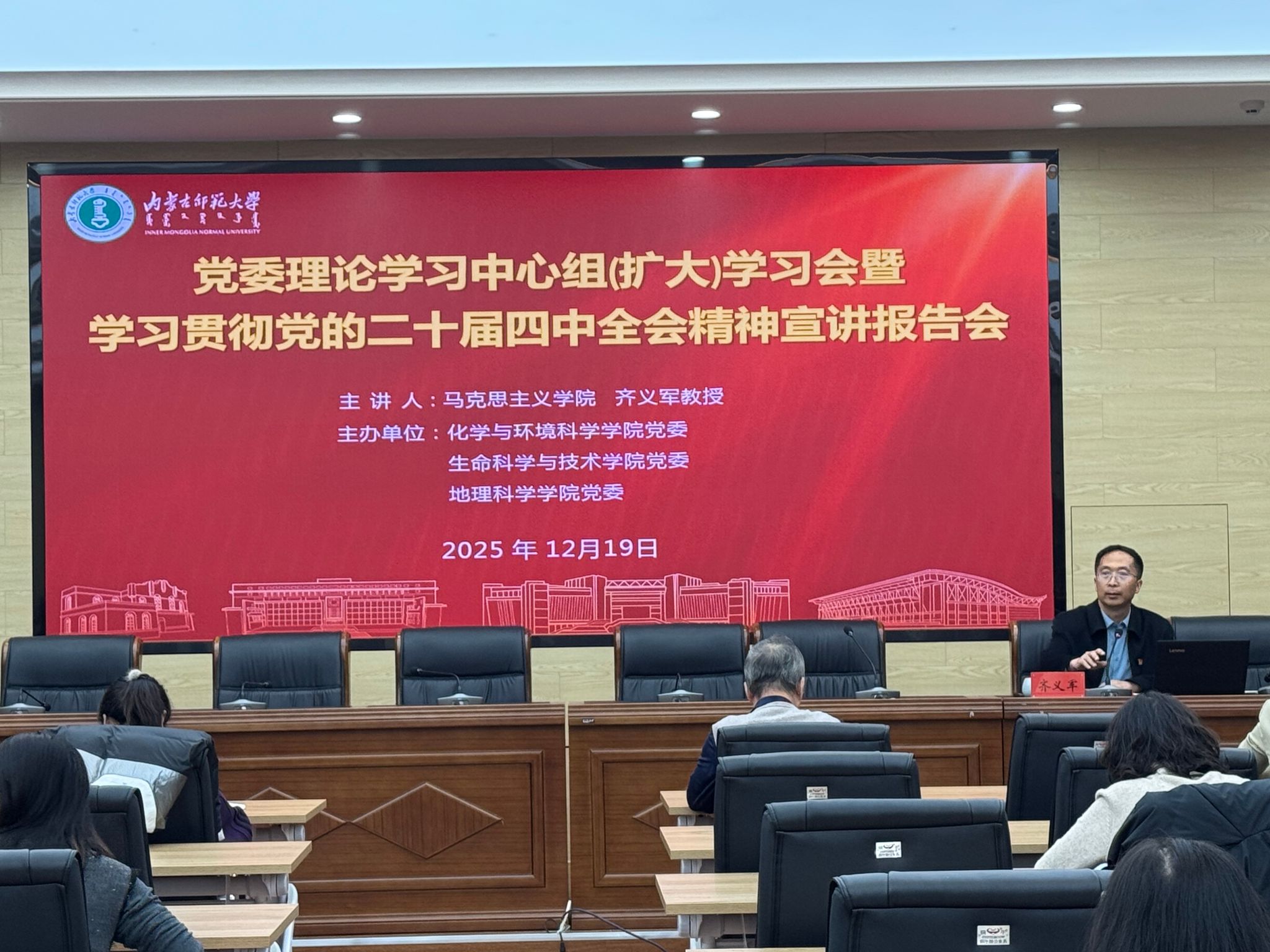 为深入学习贯彻党的二十届四中全会精神,切实把思想和行动统一到党中央决策部署上来。12月19日下午,由校党委宣传部主办,yl6809永利官网集团、地理科学学院、化学与环境科学学院联合承办了学习贯彻党的二十届四中全会精神专题报告会。马克思主义学院院长齐义军教授应邀作专题宣讲。