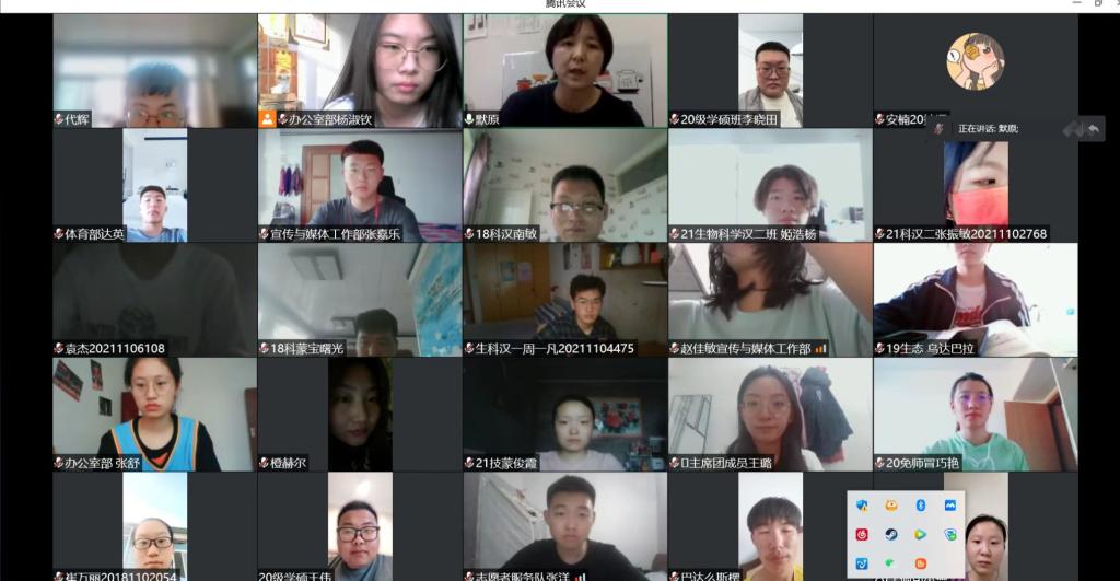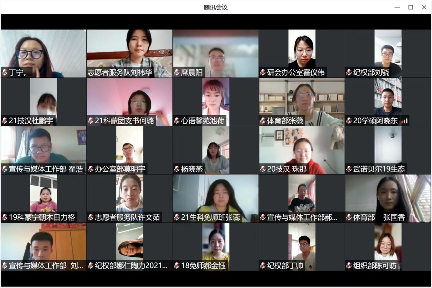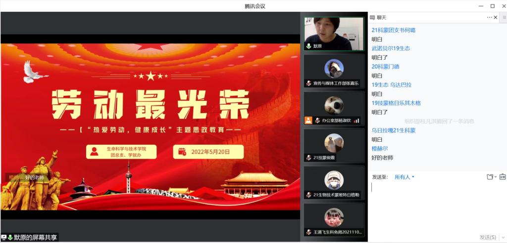 5月20日,yl6809永利官网集团召开了“劳动教育宣传月”活动交流推进会,分为研究生专场和本科生专场分别在线上召开,学就办主任默原老师、团总支副书记李自蹊老师、辅导员胡日查老师出席了会议。在两场会议上,学就办组织学生干部深入学习了习近平总书记在全国教育大会上的讲话精神和自治区相关文件,分别向研究生和本科生学生干部解读了我院《“学生劳动教育宣传月”实施细则》,并就近期我院所开展的“劳动教育宣传月”的活动进展进行了阶段性汇报,并听取了学生会各部门在实施劳动教育宣传活动的工作进展和各班实施劳动教育的典型做法。