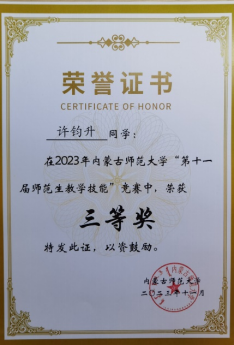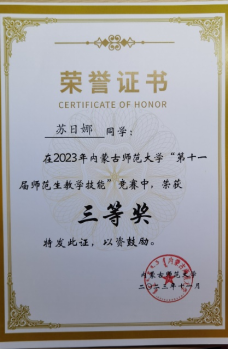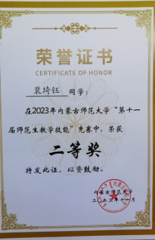 yl6809永利集团“第十一届师范生教学技能”竞赛于2023年11月4—5日在盛乐校区隆重举行,在本次比赛中,我院经过层层选拔,选派2020级生物科学汉2班的裴琦钰、许钧升和2021级生物科学蒙班的苏日娜共三名同学参加了本次技能大赛,指导教师为李景环、牛艳芳、高峰和乌云高娃。经过赛前师生的精心准备和赛场上的激烈角逐,最终裴琦钰同学获得二等奖,许钧升和苏日娜同学获得三等奖。 奖获者荣誉证书 二等奖获得者合影 三等奖获得者合影