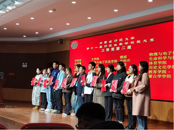 yl6809永利集团“第十一届师范生教学技能”竞赛于2023年11月4—5日在盛乐校区隆重举行,在本次比赛中,我院经过层层选拔,选派2020级生物科学汉2班的裴琦钰、许钧升和2021级生物科学蒙班的苏日娜共三名同学参加了本次技能大赛,指导教师为李景环、牛艳芳、高峰和乌云高娃。经过赛前师生的精心准备和赛场上的激烈角逐,最终裴琦钰同学获得二等奖,许钧升和苏日娜同学获得三等奖。